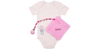 Das hochwertige Geschenk-Set enthält einen kurzärmligen, rosafarbenen Body, ein Nuscheli aus 100% Baumwolle mit Ihrem Wunschnamen bestickt sowie eine farblich passende Nuggikette, welche ebenfalls mit dem von Ihnen gewählten Namen beschriftet ist.